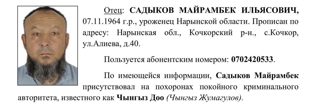 Шектүүнүн атасы Майрамбек Садыков дагы мурда эки жолу соттолгон экен. Уюшкан кылмыш тобунун жетекчилеринин бири, “Дөө Чынгыздын” уюшкан кылмыш тобунун активдүү мүчөсү катары ИИМде каттоодо турган. Кийин, “Дөө Чынгыздын” акыркы сапарга узатуусунда дагы катышкан",-деген ал.